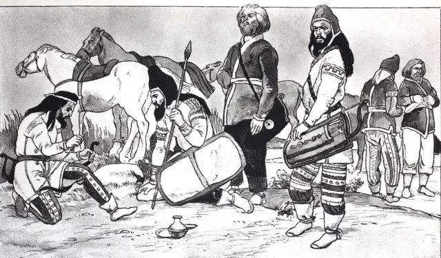 Mas muitos especialistas acreditam que povos nômades se envolveram no seu desenvolvimento, como os citas, de origem iraniana, que floresceram nas estepes euroasiáticas.
