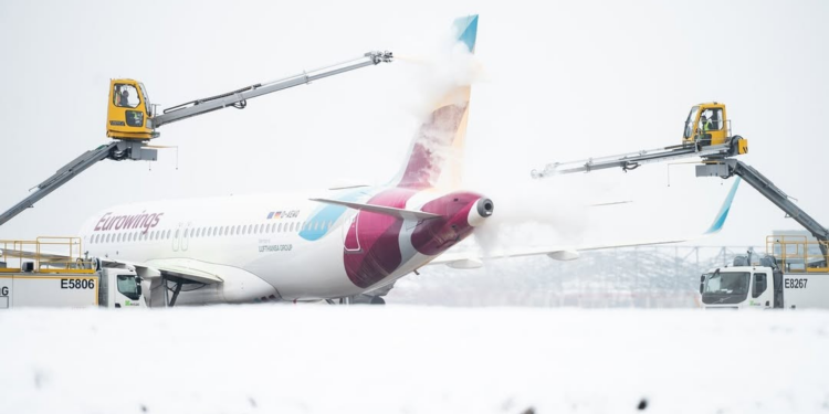 O aeroporto de Berlim, capital da Alemanha, informou na manhã desta quinta-feira (5), que as decolagens estão canceladas devido à neve e chuva.