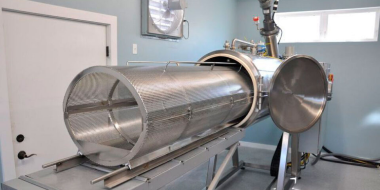 O corpo é colocado em um cilindro metálico numa máquina onde será cozido em alta temperatura em uma mistura de água e uma substância alcalina, como o hidróxido de potássio — composto químico muito semelhante à água sanitária. A temperatura varia entre 90 ºC e 150 ºC, mas como o cilindro fica sob muita pressão, a água não chega a ferver.