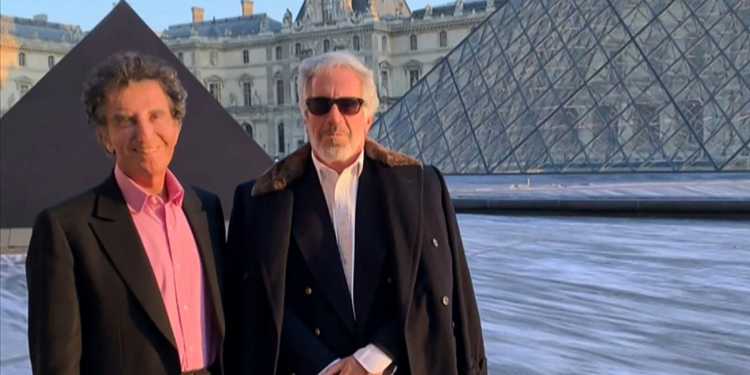 Jack Lang, ex-ministro da Cultura francês, posando com Jeffrey Epstein na pirâmide do Louvre, em Paris.