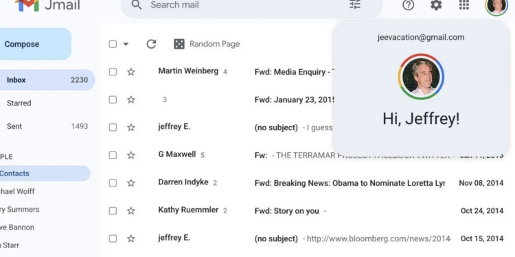 O Jmail é essencialmente uma interface que clona o Gmail, que funciona como se você estivesse visualizando os e-mails de Epstein por meio de sua conta jeevacation@gmail, diretamente da caixa de entrada real.