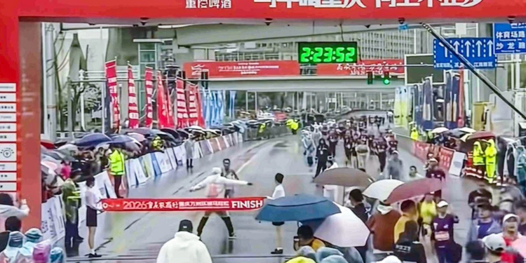 Nas imagens, após 2h23min52s, o atleta Sheng Xueli, sozinho na liderança, está a ponto de completar a corrida quando o juiz o empurra para a pista da direita, onde outros corredores participavam da meia-maratona.