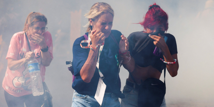 Mulheres correm em meio a gás lacrimogêneo durante um protesto em frente ao Senado argentino, em 11 de fevereiro de 2026