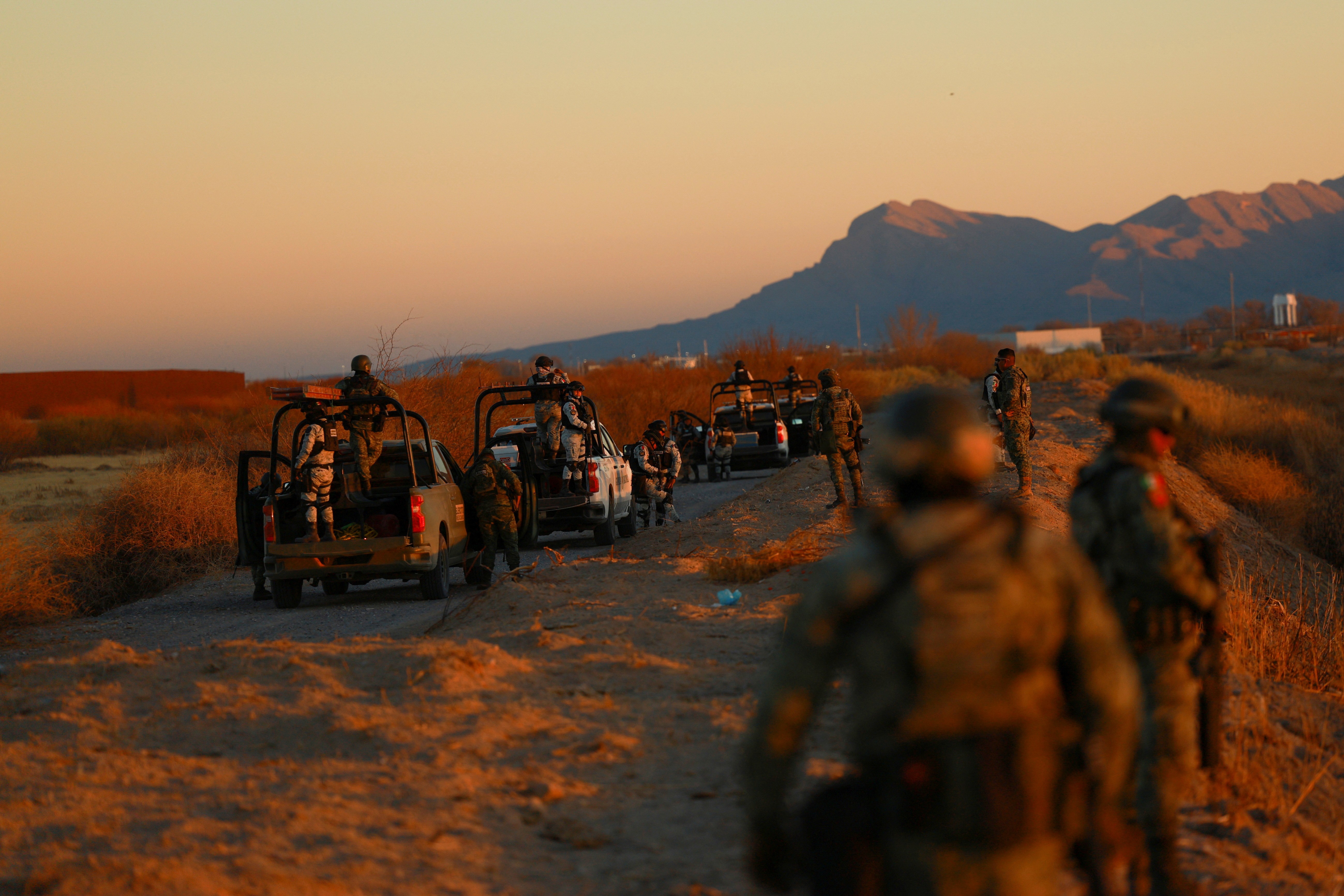 Membros da Guarda Nacional Mexicana e do Exército Mexicano patrulham o muro da fronteira entre o México e os EUA nos arredores de Ciudad Juarez