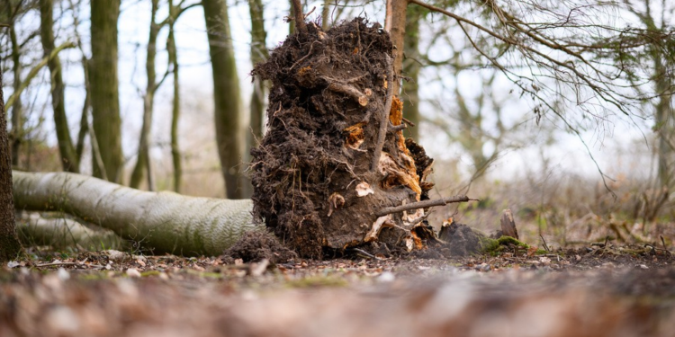 Uma árvore cai em floresta no sudeste de Flensburg, Alemanha, no domingo, 5 de abril de 2026.
