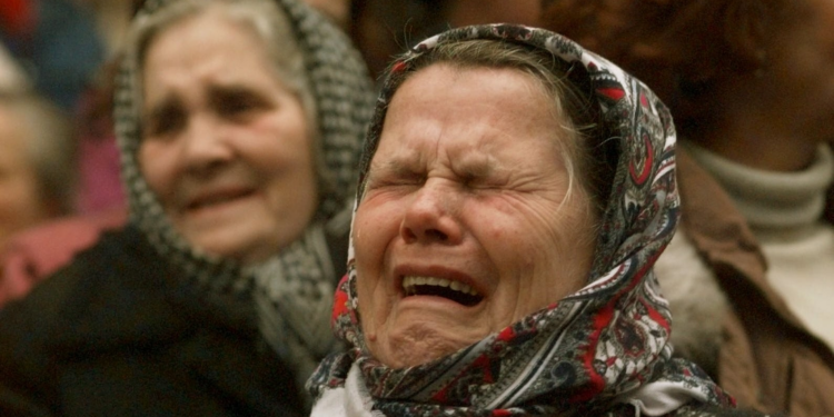 Mulheres muçulmanas bósnias choram durante um comício no centro de Sarajevo pedindo que se unam aos seus antigos vizinhos no bairro sérvio de Grbavica, em 11 de dezembro de 1995